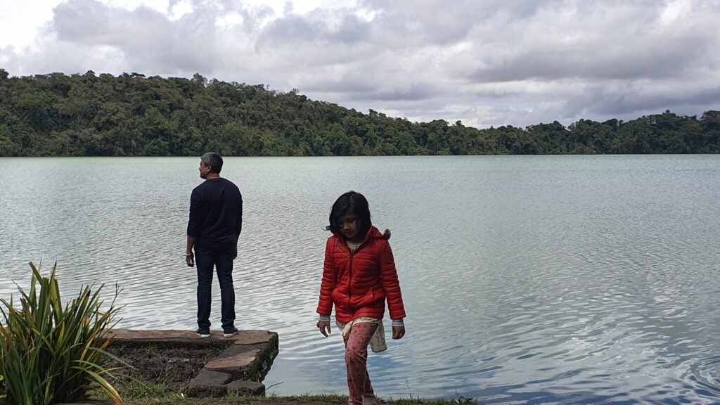 সোহান গাড়ি নিয়ে চলে এসেছে প্রায়, সেবন্তি গাড়ি দেখেই দাঁড়িয়ে গেল, গাড়িতে উঠবে। ছোট মেয়ে উঠবে না, সে হাঁটবে। আমি বললাম লেকে গিয়েও হয়তো হাঁটতে হবে, আগে হেঁটে ক্লান্ত হয়ে যেও না। সে রাজি হইলো, আমরা সবাই আবার গাড়িতে উঠলাম। এই রাস্তাটা আমাদের গ্রামের মেঠো পথের মত। পার্থক্য হলো চারপাশে অনেক গাছপালা, সূর্য উঠে নাই বলে এক টার মত বাজলেও অনেক ঠান্ডা। চারপাশটা ভেজা ভেজা লাগছে। লেকে পৌঁছানোর ৫ মিনিট আগে সোহানের আবার মনে হলো গাড়ি সাইড করে রেখে যাবে। আমরা আবার গাড়ি থেকে নেমে গেলাম। সে গাড়ি সাইড করে রেখে আমাদের সাথে, হাঁটা শুরু করলো। অল্প সামনেই একটা ক্যাম্প সাইট দেখতে পেলাম। ভেতরে রেষ্টুরেন্ট আছে। রেষ্টুরেন্টের সামনে শেড দেওয়া বসার জায়গা। লেকের চারপাশে অনেক গাছপালা আর উঁচু উঁচু পাহাড়। লেকের পাড়ে গাছের ফাঁকে ফাঁকেও বসার জায়গা আছে। আরো অনেক ইউরোপীয় টুরিস্ট ছিল। ওরা খোঁজখবর নিচ্ছিল বোটে করে ঘুরতে কত লাগে। লেকের চারদিকে সরকারি ভাবে ওয়াকওয়ে বানানো। সেখানে হাঁটতে হলে টিকেট কাটা লাগবে। বোটে ঘুরতে আমাদের কাছে জনপ্রতি ৩০ ডলার চাইলো। চারজনের নৌকাভ্রমণ খুবই ব্যয়বহুল হয়ে যাবে। আমরা ওখান থেকে চলে আসছিলাম, তখন বললো আমাদের জন্য কমিয়ে ২০ ডলারে দিবে। সেটাও তো আমাদের জন্য অনেক হয়ে যায়। সেখান থেকে বের হয়ে হাঁটবো ভাবছিলাম কিন্তু পাশেই আরেকটা কিছুটা সাদামাটা ক্যাম্প সাইট দেখে ওখানে ঢুকে গেলাম। সেখানেও একটা রেষ্টুরেন্ট আছে, রেস্টুরেন্ট দেখলেই আমার বড় মেয়ের চিকেনের ক্ষুধা পায়, আর ছোট মেয়ের ফ্রেঞ্চ ফ্রাইয়ের ক্ষুধা। এখানে খাবার অর্ডার করতে করতে জানতে চাইলাম নৌকায় ঘুরতে কত লাগবে , তানজানিয়ান একটা ছেলে হোসেইন জানালো, পুরোটা ঘুরতে ৮০০০০ শিলং আর অর্ধেক ঘুরতে ৪০০০০ শিলং লাগবে। আমাদের জন্য খুবই চমৎকার প্রস্তাব। সোহান তার সাথে কথা বলে সব কিছু ঠিকাঠাক করে গেল গাড়ি ক্যাম্প সাইটে নিয়ে আসতে।