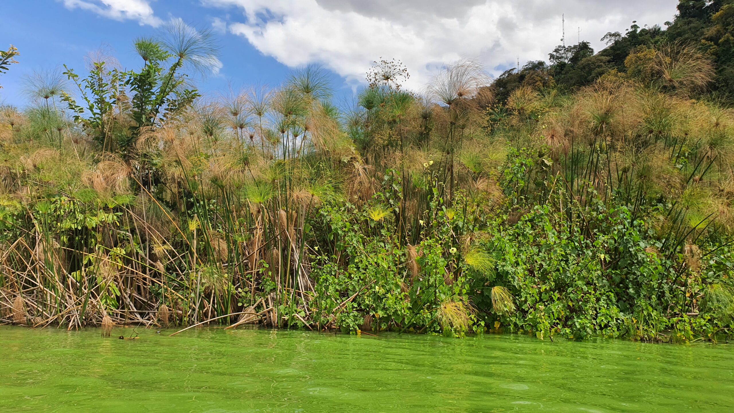 লেকের পানি একদম সবুজ কিন্তু টলটলে পরিস্কার। আমাদের সামনেই একটা আফ্রিকান মেছো ঈগল বড় একটা মাছ শিকার করে দ্রুত নিয়ে গেলো। হোসেইন ধীর গতিতেই নৌকা বাই ছিল আর সোহানের প্রশ্নের উত্তর দিচ্ছিল। এই লেকে সাঁতার কাটা এবং মাছ ধরা নিষেধ। লেকটি ভি-শেপ, মাঝখানে বেশ গভীর; প্রায় ১৫০ মিটারের মত বলে জানাল হোসেইন। লেকটি পাড় থেকে ধীরে ধীরে মাঝ বরাবর গভীর হয়ে গিয়েছে। সারাবছরই লেকে এমন পানি থাকে, ভূ-গর্ভস্থ পানি আর সারাবছরের বৃষ্টিপাত লেকের পানির উৎস। লেকের পানির উপরেই যে গাছপালা তাতে অনেক বাবুই পাখির বাসা দেখতে পেলাম। এছাড়া বড় পুরানো একটা গাছের উপর দেখলাম বিশাল বড় একটা পাখির বাসা। সোহান জানালো এটা হামার কপ পাখির বাসা। অনেক প্যাপিরাস গাছ; ঐ যে ছোট বেলায় পড়েছিলাম আমরা, প্যাপিরাস গাছ থেকেই কাগজের উৎপত্তি। ঝোপের নিচ দিয়ে পানকৌড়ি আর ডাহুক পাখি ঘুরছিল, মানুষের সাড়া পেয়ে লুকিয়ে গেলো।